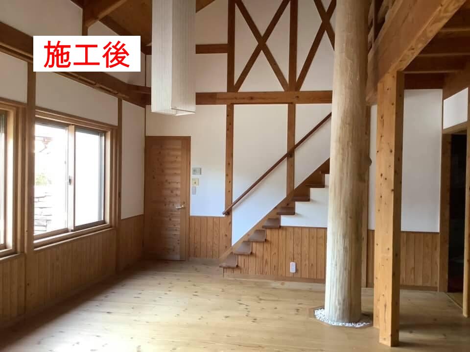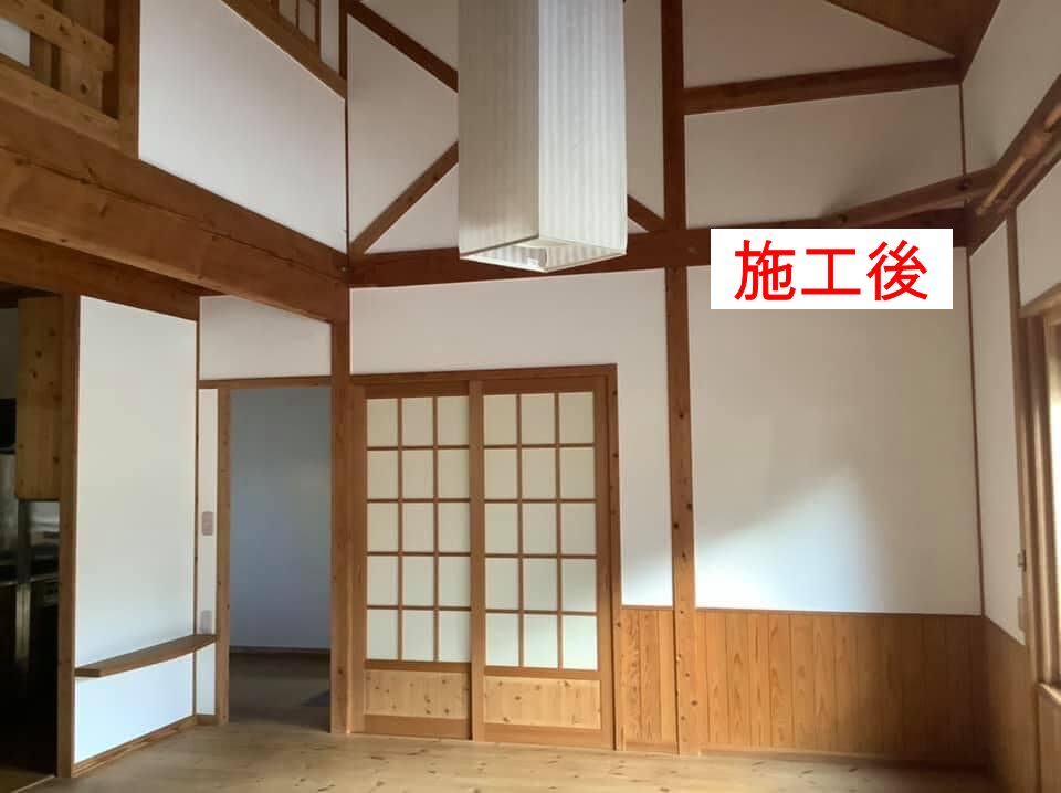 室内の塗り壁塗装です。年数が経ち、汚れとシミが目立ちます。そこで珪藻土とクロスの上から塗る漆喰を、ローラー塗りで施工させて頂きました。