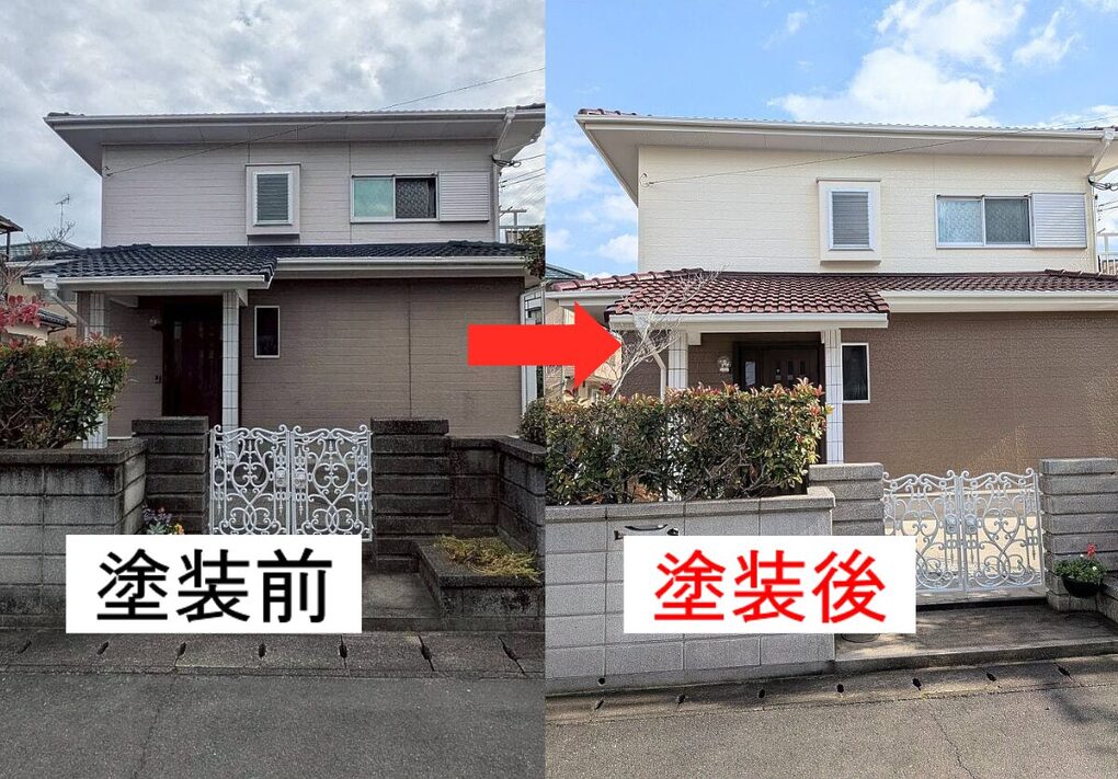 前回の塗装より10数年経たれており、チョーキング現象、屋根の塗装の剥がれなどがありました。お色選びで少し悩まれましたが、施工が終わり大変喜んで頂きました。