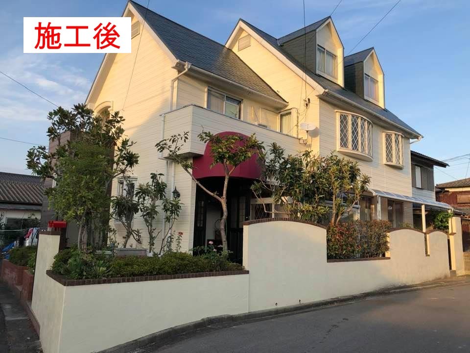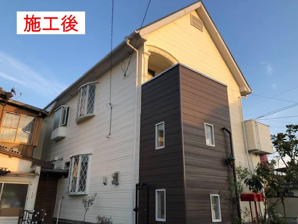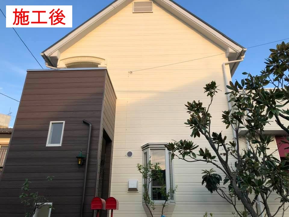 築20年以上になる、おしゃれな元カフェを施工させて頂きました。初めての外壁塗装で、かなり傷みが激しく、サイディングの一部を貼り換え及びテントの交換もさせて頂きました。色のバランスも施主様に気に入って頂きました。
